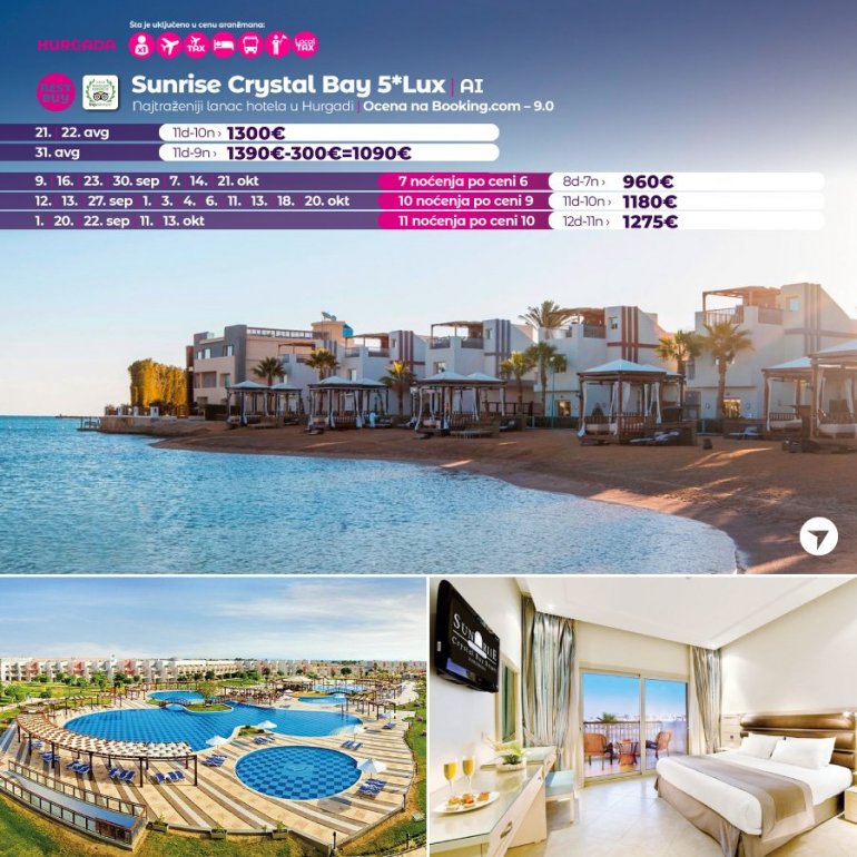 Sunrise Crystal Bay je luksuzni resort sa 5* koji se nalazi direktno na sopstvenoj peščanoj plaži. Od aerodroma je udaljen oko 15 kilometara, a od Hurgade oko 20 kilometara ka jugu.