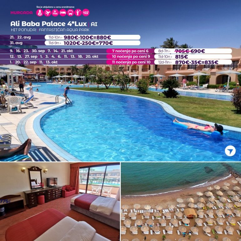 Ali Baba Palace je luksuzni hotel sa 4* otvoren 2001.godine na 120 000m2, koji se nalazi 15 kilometra od centra Hurgade i 8 kilometara od aerodroma, južno ka Safagi. Hotel ima sopstvenu peščanu plažu, prelepo uređen vrt, veliki bazen koji daju kompleksu utisak oaze. Hotel raspolaže sa 654 standardne sobe, od kojih sve imaju klimu, SAT TV, mini frižider, sef, balkon. Gostima hotela su na raspolaganju najveći otvoreni bazen u Hurgadi (2700 m2), zatvoreni bazen, dečiji bazen koji se greje, igralište, glavni restoran, italijanski restoran, orijentalni restoran, 5 barova (na plaži, pored bazena, u lobiju), fitnes centar, 2 teniska terena, minigolf, odbojka na plaži, stoni tenis, mini klub za decu, kuglanje, klizanje, sauna, sobe za masažu, đakuzi, parno kupatilo, centar za sportove na vodi. Usluga u hotelu je na bazi all inclusive koncepta po pravilima hotela.