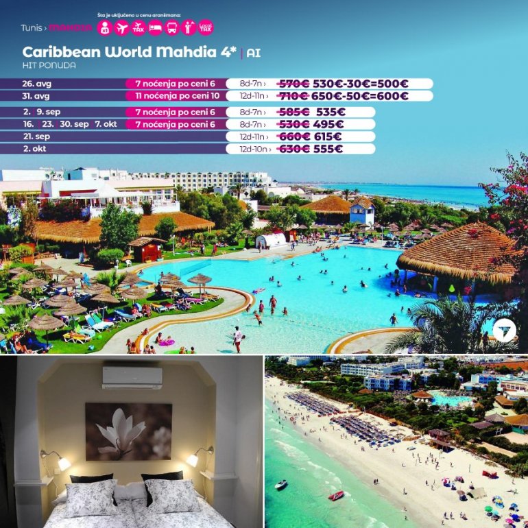 Caribbean World hotel smešten je u letovalištu sa najlepšim plažama – Mahdia. Od aerodroma u Monastiru udaljen je oko sat vremena i ima svoju plažu. Sobe su standardno opremljene, klimatizovane sa sopstvenim kupatilom i balkonom/terasom. U sklopu hotela je spoljni i unutrašnji bazen. Hotel poseduje restoran i bar. Dečiji klub namenjen za najmlađe je dostupan. Fitness studio i teretana su takođe dostupni.