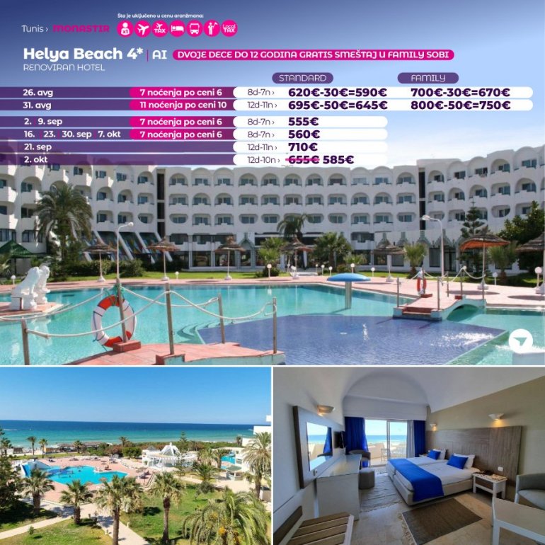 Ovaj hotel se nalazi ispred plaže Skane-Monastir i raspolaže prelepim pogledom na Sredozemno more. Smeštaj sa 4 zvezdice obuhvata privatnu terasu, a hotel takođe poseduje 4 bazena i spa centar. Sve sobe hotele Helya Beach Resort nedavno su renovirane i obuhvataju sopstveno kupatilo, klima-uređaj i TV sa satelitskim kanalima. Hotel Helya raspolaže mnogim barovima i restoranima. Sa izborom šou kuvanja u restoranu Rubis, picerije Le Safir, hamburgera i krompirića u restoranu Barbeque, svaki gost će pronaći nešto za sebe. Spa centar Thalasso Biocure nudi moderne zdravstvene i wellness sadržaje na preko 300 m². Centar obuhvata hamam, saunu, škotski tuš, kadu sa podvodnom masažom, kabinu Vichy, mlazni tuš, tretmane lica i tela algama, kao i antistres masaže. Hotel se može pohvaliti sa 4 bazena. Dva su na otvorenom i namenjena odraslim osobama, a tu su i otvoreni bebi bazen i grejani bazen. Gostima je na raspolaganju takođe fitnes centar. Možete koristiti teniske terene, terene za odbojku, rukomet, košarku i mini-golf, a tu je i dnevni zabavni program.