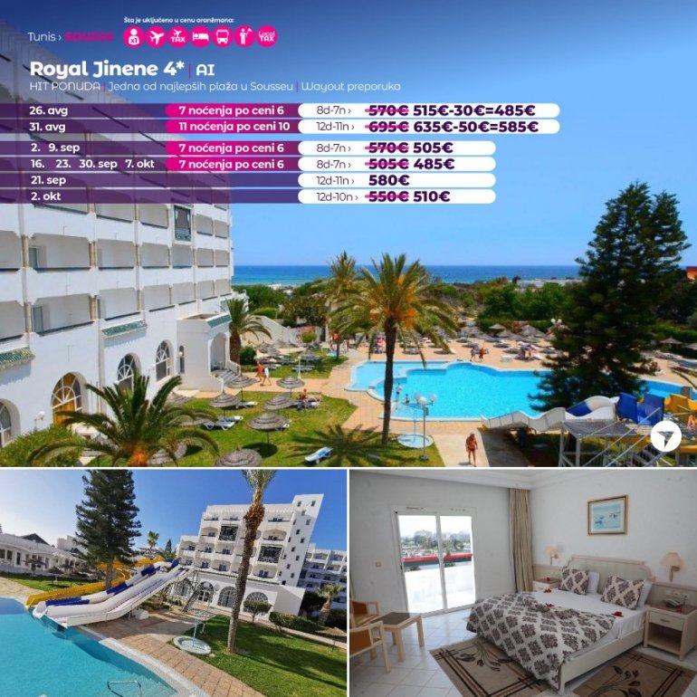 Hotel se nalazi na plaži, udaljen je 3km od centra Sousse, 3km od centra Port el Kantaoui i 23km od aerodroma u Monastiru. Pripada hotelskom kompleksu Jinene koji čine dva hotela- Jinene3* i Royal Jinene 4*. Hotelski kompleks ima zajednički sadržaj. Hotel sadrži otvoren bazen sa delom za decu, saunu, fitnes, tursko kupatilo, mini klub, stoni tenis, bilijar, menjačnicu. Plaža je peščana sa sitnim peskom, jedna od najlepših u ovom delu Sousa. Suncobrani i ležaljke su dostupni za goste hotela.