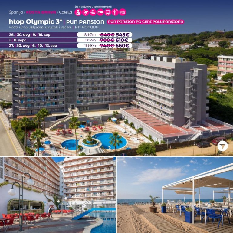 Ovaj objekat je udaljen 5 minuta hoda od plaže. Smešten na 300 metara od plaže Kalelja, objekat htop Olympic #htopEnjoy poseduje tri otvorena bazena za odrasle i decu. Sve sobe imaju klima-uređaj, sopstveni balkon ili terasu i TV sa satelitskim kanalima. U hotelu H Top Olympic se organizuje besplatan program aktivnosti za decu uzrasta do 12 godina, koji je na raspolaganju šest dana u nedelji. Dostupni su bazen za malu decu i igralište. U restoranu sa uslugom na bazi švedskog stola služe se jela katalonske, španske i internacionalne kuhinje. U okviru objekta nalazi se i bar. Večernji zabavni program uključuje živu muziku i kabaretske predstave. Gostima je dostupna besplatna usluga prevoza do obližnjih hotela iz lanca H Top (hotel nudi uslugu samo u jeku sezone, za više informacija kontaktirate objekat). Hotel H Top Olympic se nalazi u Kalelji, na Kosta del Marezme. Aerodrom Đirona udaljen je 32 km. Barselona se nalazi na nešto više od 40 km.