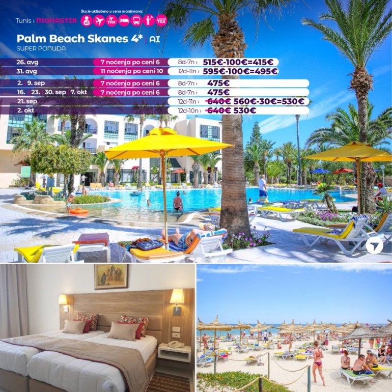 Isključivo sa AirSerbia u Tunis! 7 noćenja po ceni 6 noćenja / 10 noćenja po ceni 9 noćenja / 11 noćenja po ceni 10 noćenja. Izdvajamo iz ponude najtraženije hotele za leto 2023: