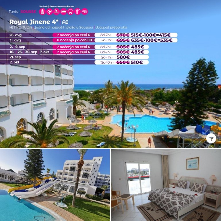 Hotel se nalazi na plaži, udaljen je 3km od centra Sousse, 3km od centra Port el Kantaoui i 23km od aerodroma u Monastiru. Pripada hotelskom kompleksu Jinene koji čine dva hotela- Jinene3* i Royal Jinene 4*. Hotelski kompleks ima zajednički sadržaj. Hotel sadrži otvoren bazen sa delom za decu, saunu, fitnes, tursko kupatilo, mini klub, stoni tenis, bilijar, menjačnicu. Plaža je peščana sa sitnim peskom, jedna od najlepših u ovom delu Sousa. Suncobrani i ležaljke su dostupni za goste hotela.