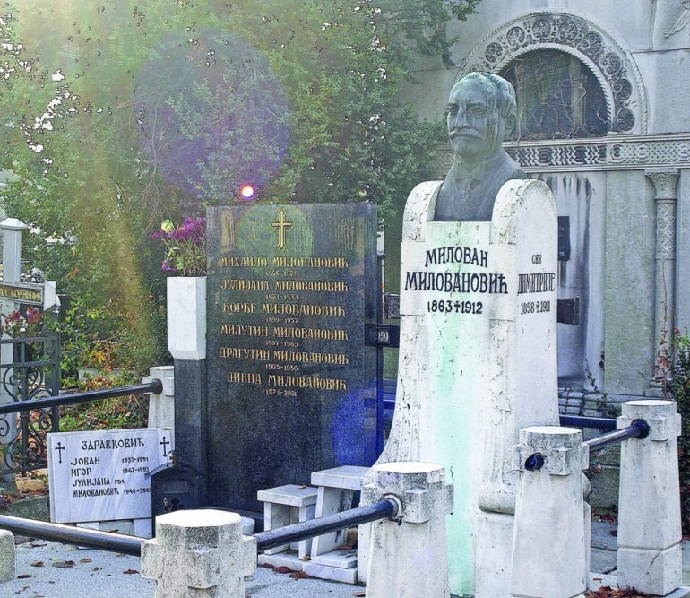 Nadgrobni spomenik Milovana Milovanovića na Novom groblju u Beogradu , Foto Arhiv Srbije, Istorijski muzej Srbije, Dokumentacija „Novosti“ i „Borbe“, Fejsbuk i Vikipedija