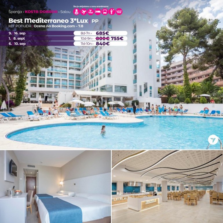 Hotel Best Mediterraneo nalazi u centru mesta Salou, na 5 minuta šetnje od plaže Kapelans. Nudi otvoreni bazen, recepciju koja radi 24 sata i klimatizovane sobe sa TV-om i privatnim kupatilom. Hotel je 10 minuta vožnje od tematskog parka PortAventura. Nalazi se na centralnoj lokaciji, okružen restoranima, barovima i prodavnicama. Hotelski restoran na bazi švedskog stola služi španska i internacionalna jela. Tu je i kafe-bar koji služi pića i snekove tokom celog dana.
