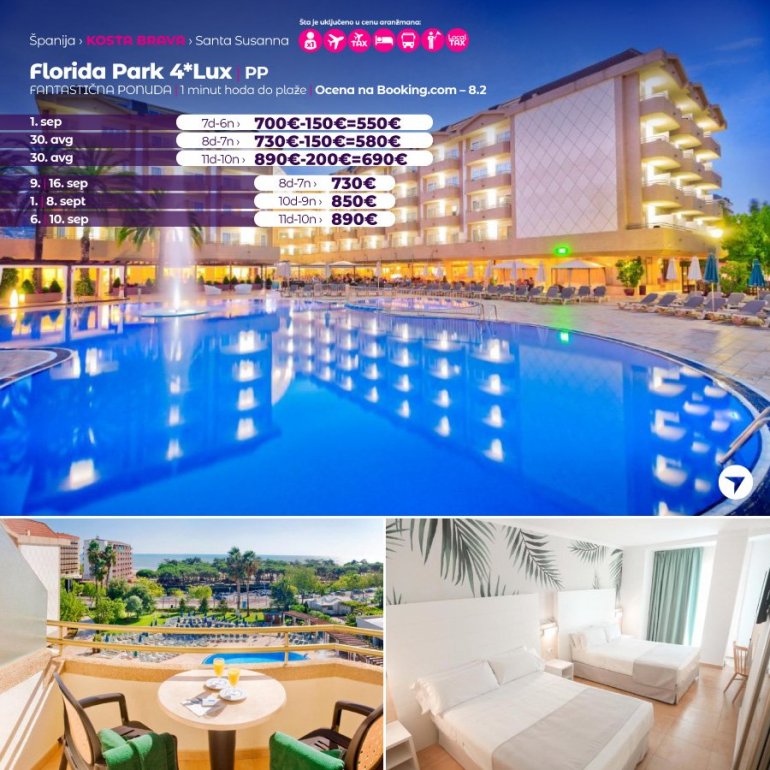 Ovaj objekat je udaljen 2 min hoda od plaže. Ovaj veliki hotel pogodan je za odmor ispunjen zabavom. Poseduje spa centar i nalazi se u oblasti Kosta Maresme u Španiji. Gosti mogu koristiti prostrani bazen hotela ili posetiti prelepe plaže u Santa Susani, udaljene svega 75 metara. Pored otvorenog bazena za odrasle, hotel Florida Park raspolaže takođe dečijim bazenom i hidromasažnom kadom na otvorenom. Spa centar nudi saune, teretanu, zatvoreni bazen sa toplom vodom i hidromasažne kade. Svake večeri, gosti mogu uživati u živom zabavnom programu nakon ukusnog obroka u restoranu sa uslugom na bazi švedskog stola.