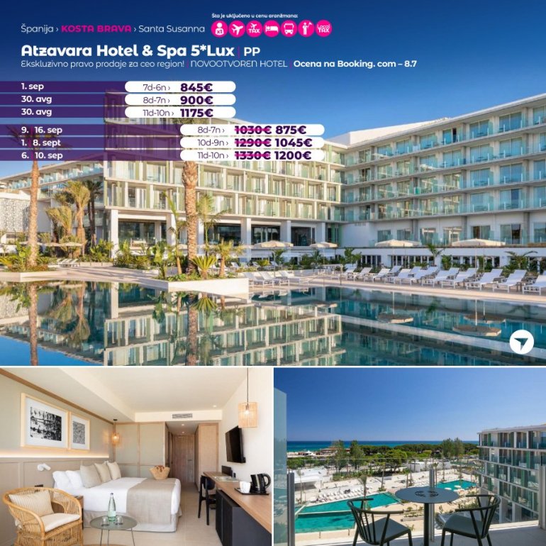 Atzavara Hotel & Spa je hotel novijeg datuma, savremenog dizajna. Hotel je smešten u mestu Santa Susana, između mora i planina. Od aerodroma u Barseloni udaljen je 75km. Sobe su u boho stilu, sa LCD TV, klimom i sopstvenim kupatilom. U blizini hotela su plaže: Llevant, gradska plaža Santa Susanna i Platja de les Caletes. Gostima na raspolaganju je 5 bazena, recepcija 24h, SPA centar, besplatan WiFi, restoran i nekoliko barova. Gosti mogu da uživaju i na terasi hotela. Za najmlađe se u hotelu nalazi dečiji klub.