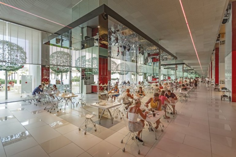 Što se tiče gastronomskih užitaka, ni tu kvalitet ne izostaje. Osim redovnih obroka u glavnom restoranu, brojnih snack barova i kafića, gostima je na raspolaganju čak sedam a la carte restorana, od kojih su posebno poznati restoran „Blind“, gde se večera u potpunom mraku i restoran „Eros“ u kom je romantična atmosfera i služe se jela koja su pravi afrodizijak. S obzirom da je ovaj restoran dizajniran za parove, u skladu sa tim možete večerati na crvenom krevetu. Baš kao ovi restorani, u hotelu je i sve drugo interesantno i koncipirano na specifičan način. Umesto fasade, hotel je čitav prekriven zelenom, veštačkom travom, a hol je ukrašen sa čak 4.980.000 ogledala.