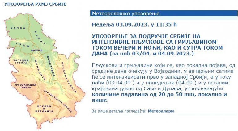 - Upozorenje za područje Srbije na intenzivne pljuskove sa grmljavinom tokom večeri i noći, kao i sutra tokom dana (za noć 3. na 4. i 4. septembar). Pljuskovi i grmljavine koji se, kao lokalna pojava, od sredine dana očekuju u Vojvodini, u večernjim satima će se intenzivirati prvo u zapadnoj Srbiji, a u toku noći i u ponedeljak i u ostalim krajevima južno od Save i Dunava, uslovljavajući količine padavina od 20 do 50 mm, lokalno i više - navedeno je.