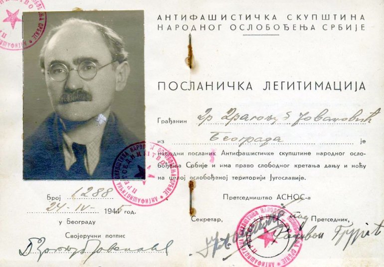 Jovanovićeva poslanička legitimacija iz 1945. godine , Foto Arhiva porodice Jovanović, Arhiv SANU, Muzej Srbije, Dokumentacija „Novosti“ i Vikipedija