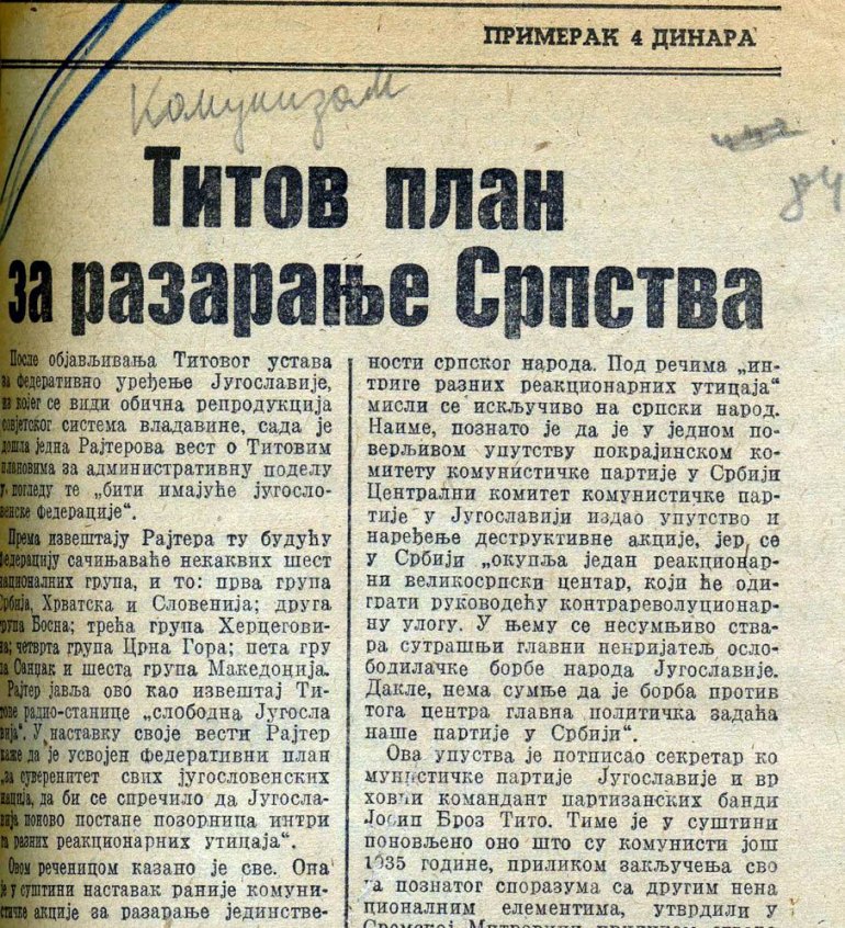Jovanovićev tekst „Titov plan za razaranje srpstva“ iz 1943. godine , Foto Arhiva porodice Jovanović, Arhiv SANU, Muzej Srbije, Dokumentacija „Novosti“ i Vikipedija