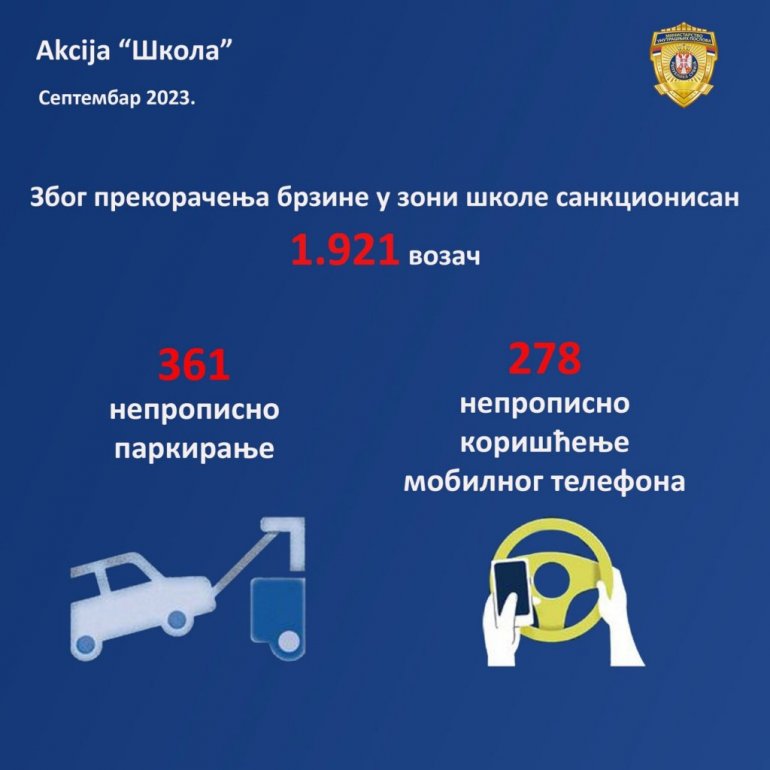 Zbog prekoračenja brzine u zoni škole sankcionisan je 1.921 vozač, zbog nepropisnog parkiranja sankcionisan je 361 vozač, dok je 278 vozača sankcionisano zbog nepropisnog korišćenja mobilnog telefona za vreme vožnje u zoni škole.