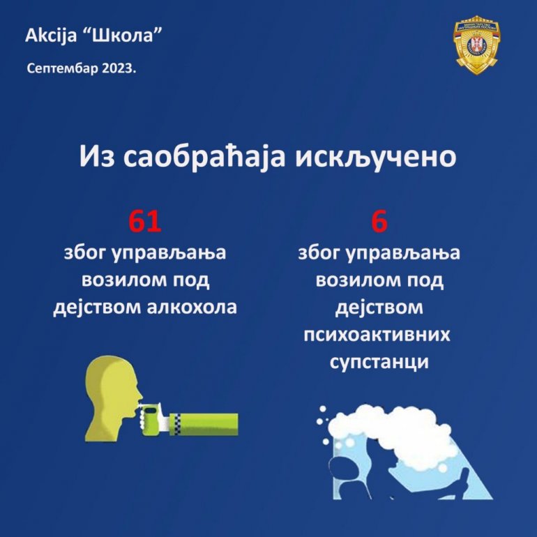 Pored toga, 61 vozač isključen je iz saobraćaja zbog upravljanja vozilom pod dejstvom alkohola, a šest vozača zbog upravljanja vozilom pod dejstvom psihoaktivnih supstanci u zoni škole.