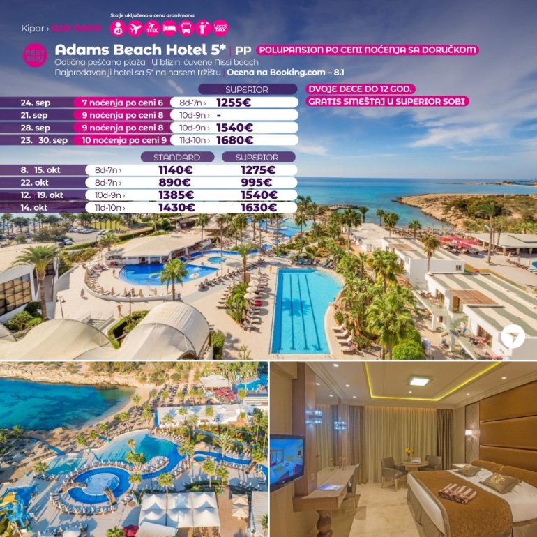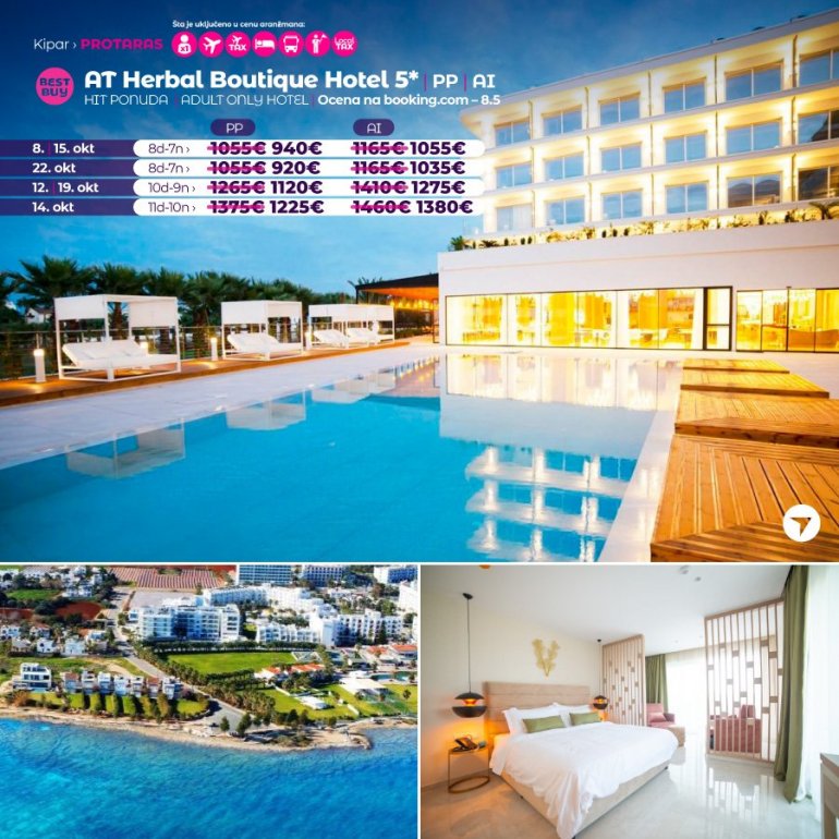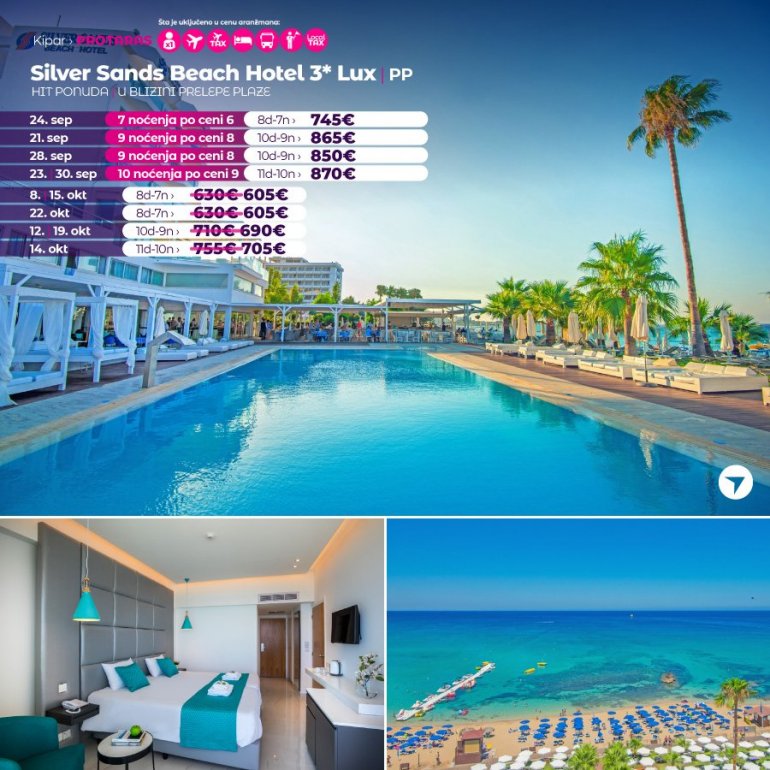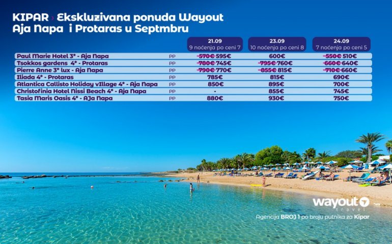 Definitivno nova omiljena letnja destinacija naših turista, svakako jeste rajsko ostrvo Kipar. Osetite čari Mediterana, fantastičnih plaža, veoma kvalitetnih hotela, izuzetne gastronomske ponude, kao i nezaboravnog noćnog provoda. Za naše putnike smo spremili odličnu first minute ponudu sa pažljivo izabranim hotelima, kako na osnovu pređašnjih iskustava naših klijenata, tako i na osnovu odličnih ocena na turističkim portalima.