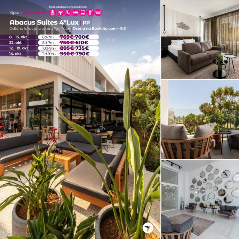 Abacus Suites je potpuno nov hotel, sa najvišim ocenama na turističkim portalima. Izuzetno je lociran, na nekoliko minuta hoda od centra Aja Nape i plaže. U neposrednoj blizini hotela nalaze se restorani, kafići, barovi, prodavnice i stanica gradskog prevoza. Idealan je izbor kako za parove, tako i za porodice, zbog prostranih soba i usluge koja može biti polupansion ili all inclusive.