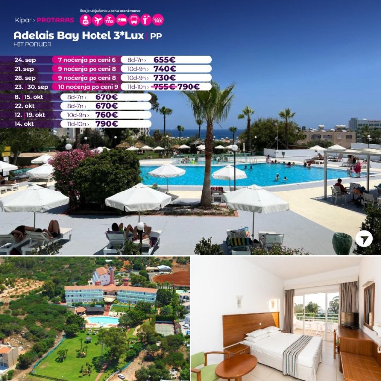 Hotel Adelais Bay udaljen je 500m od plaže Green bay, plaža koja se nalazi između čuvene Fig Tree plaže i Konnos plaže. Hotelski prostor pokriva velika bašta sa otvorenim bazenom. Sobe su klimatizovane sa SAT TV i balkonom ili terasom. Svaka soba poseduje sopstveno kupatilo sa fenom za kosu. U sastavu hotela je Aurora restoran i bar Ilios pored bazena. Opremljen je sa igralištem na otvorenom sa stolicama za ljuljanje i igraonicom, dok se uz doplatu može obezbediti usluga čuvanja dece. Grad Protaras udaljen je od hotela 15 minuta hoda.