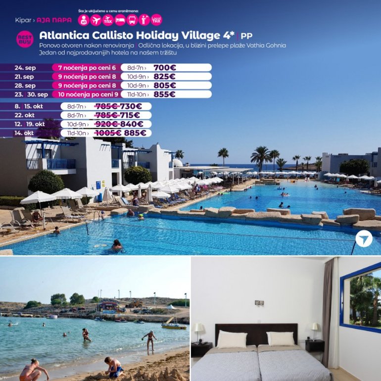 Callisto je kompleks osmišljen kao kopija tradicionalnog mediteranskog sela sa belim dvospratnim vilama plavih šalona, prozora i vrata. Vile su okružene egzotičnim drvećem i cvećem, povezane uzanim stazama sa centralnim delom hotela, u kome se nalazi restoran, recepcija, bezeni i prolaz do prelepe peščane plaže. Idealan izbor za porodice sa decom i sve ostale koji uživaju u raskošnoj prirodi, a na nekoliko minuta hoda od glavne ulice poznatog letovališta Aja Napa. Centar grada udaljen je 1,5km. Besplatan ulaz u akva park nedaleko od hotela!