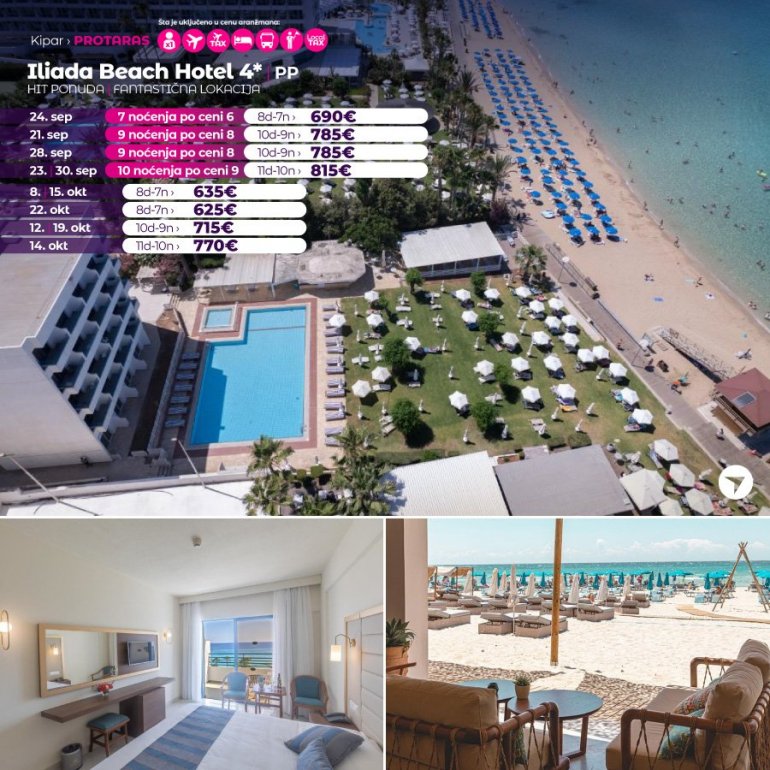Hotel Iliada Beach je smešten odmah pored peščane plaže u centru Protarasa i nudi bazen sa terasom koja gleda na more. Na raspolaganju su vam takođe dečji bazen, dva restorana, tri bara i snek bar. Sve sobe u hotelu Iliada Beach imaju namešten balkon, TV sa satelitskim kanalima, mini-frižider, aparat za pripremu čaja/kafe i sef.Na plaži ispred samog hotela možete uživati u velikom izboru sadržaja za sportove na vodi, dok se restorani, prodavnice i barovi nalaze na nekoliko minuta hoda. Najbliži aerodrom je Aerodrom Larnaka, udaljen 42 km od hotela Iliada Beach.