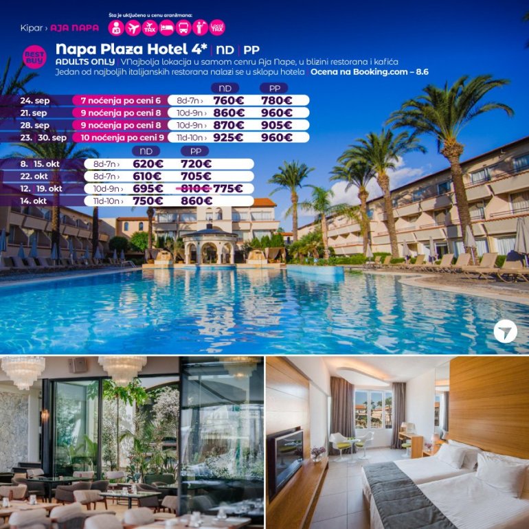 Ovo je moderan i atraktivan hotel sa četiri zvezdice u srcu Aja Nape. Namenjen je samo odraslim gostima, a izgrađen je 1989. godine u blizini srednjovekovnog manastira. Ovaj centralno locirani savremeni i jedinstveni hotel koji je sagrađen u stilu trga nudi gostima privatnost, prefinjenost i personalizovanu uslugu, što se i očekuje od višestruko nagrađivanog sofisticiranog okruženja prilagođenog odraslima. Hotel je udaljen 7 minuta hoda od najbliže gradske plaže, kilometar od popularne Grecian bay plaže, 3 km od Nissi plaže i 4,5 km do Waterworld vodenog parka. Objekat se nalazi u samom centru Aja Nape, okružen prodavnicama, kafićima i restoranima. Autobuska stanica i stari Manastir su u neposrednoj blizini, a nedaleko su i muzej Thalassa, podvodni muzej Musan, park skulptura i kaktusa.