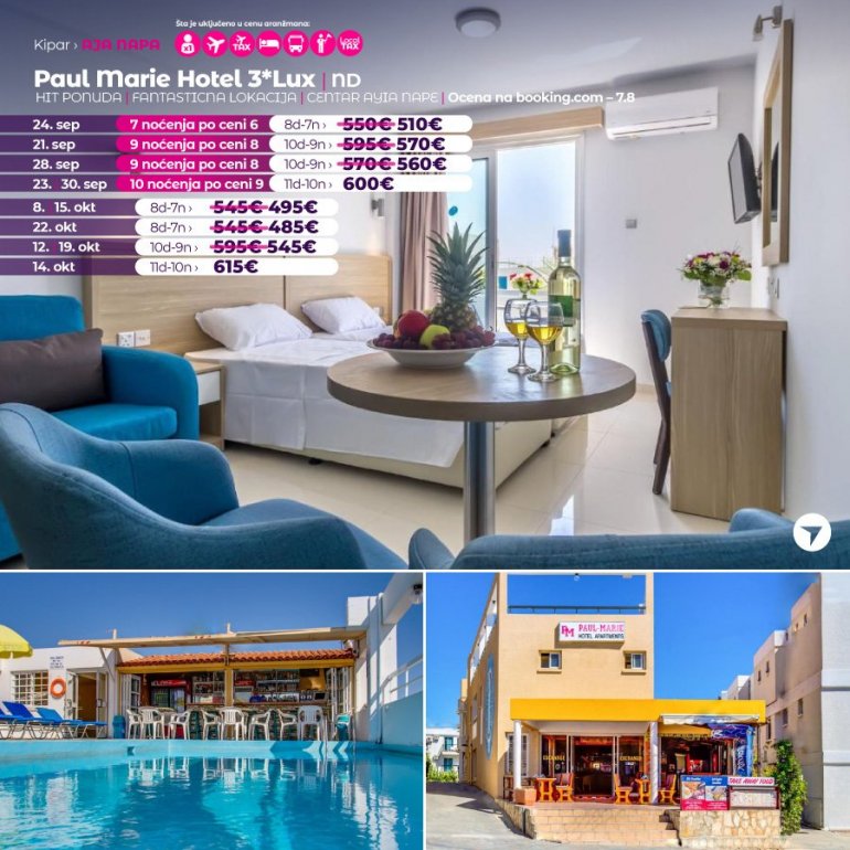 Objekat Paul Marie Hotel Apartments je smešten u centru letovališta Aja Napa i raspolaže restoranom i krovnim bazenom na otvorenom. WiFi je dostupan u zajedničkim prostorijama. Studiji i apartmani u objektu Paul Marie Hotel sadrže prostor za sedenje i balkon sa pogledom na vrt. Osim toga, imaju čajnu kuhinju sa pločama za kuvanje i posuđem. Kupatila u smeštajnim jedinicama su opremljena fenom za kosu i tušem. Objekat Paul Marie Hotel Apartments takođe nudi snek bar i recepciju koja radi non-stop. Međunarodni aerodrom Larnaka je udaljen oko 60 km. Ponuda objekta obuhvata i besplatan parking.