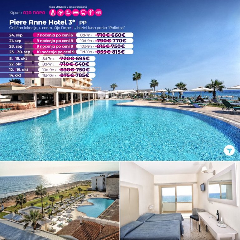 Hotel Piere Anne ima odličnu lokaciju na obali mora, na 5 minuta od centra Aja Nape i na 5 minuta od luke i plaže. Zabavni park Parko Paliatso Fun se takođe nalazi odmah iza hotela, zajedno sa čuvenom ulicom Nissi Avenue. U neposrednoj blizini nalaze se prodavnice, barovi i restorani, a svi sadržaji Aja Nape su na dohvat ruke. Hotel Piere Anne se sastoji od 3 bloka soba sa 2 velika otvorena bazena.Bazeni imaju direktan pristup stazi uz more, a bar pored bazena "En Plo" je odlično mesto za opuštanje tokom dana. Iako hotel nema mnogo sadržaja na licu mesta, Piere Anne je toliko blizu svega u Aja Napi da je odlična baza za zabavu na plaži ili provod u klubovima, kao i odmor uz Mediteran.