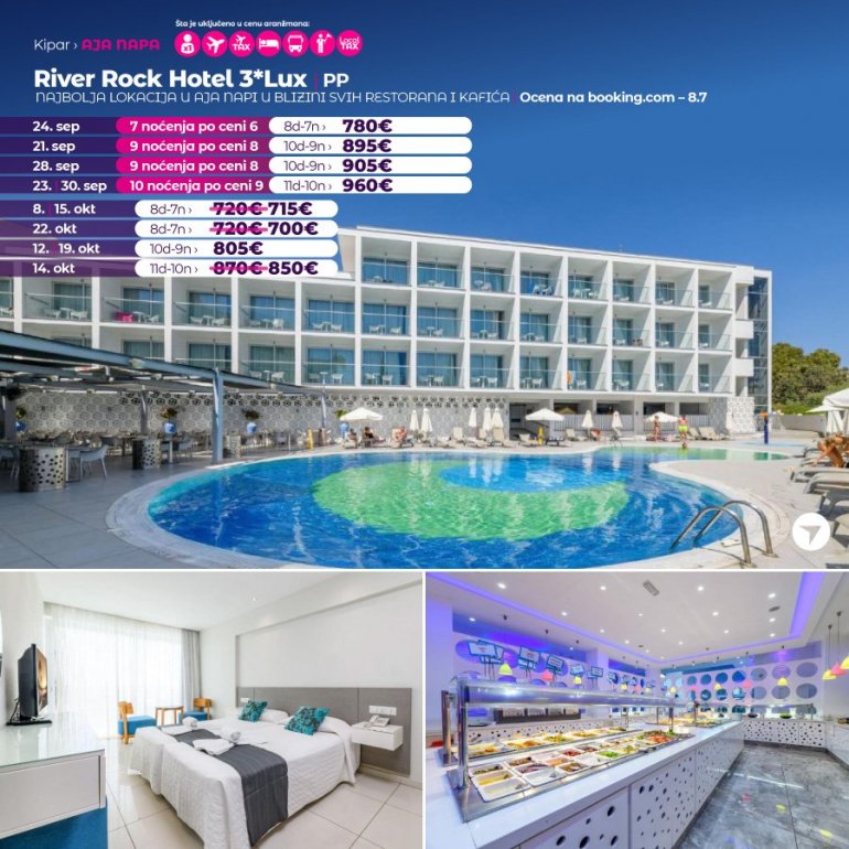 Hotel River Rock nalazi se u mestu Aja Napa i poseduje otvoreni bazen i terasu za sunčanje. Na raspolaganju je dečije igralište, a besplatan bežični internet je dostupan u celom objektu. Sve sobe nude balkon sa pogledom na grad. Pored toga sadrže flat-screen TV i klima-uređaj. Gostima je na raspolaganju sopstveno kupatilo sa tušem i fenom za kosu. Dodatne pogodnosti uključuju sef, frižider i posteljinu. Ponuda hotela River Rock uključuje recepciju koja radi non-stop, vrt i bar.