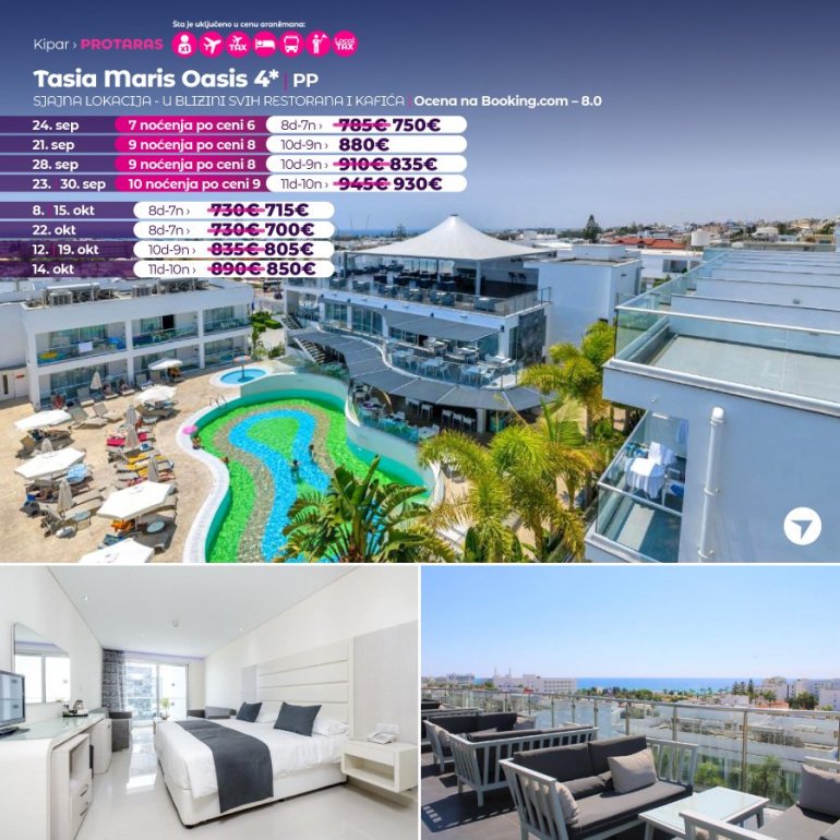 Smešten na padini, na samo 5 minuta hoda od centra Aja Nape, objekat Tasia Maris Oasis nudi moderno uređene smeštajne jedinice sa besplatnim bežičnim internetom i sopstvenim balkonom. Uključuje bazen slobodnog oblika, 2 restorana i 2 bara. Grčka plaža, najveća peščana plaža u Aja Napi, udaljena je samo 10 minuta hoda. Na pešačkoj udaljenosti nalaze se restorani, barovi i prodavnice. Parking u okviru objekta može se besplatno koristiti.