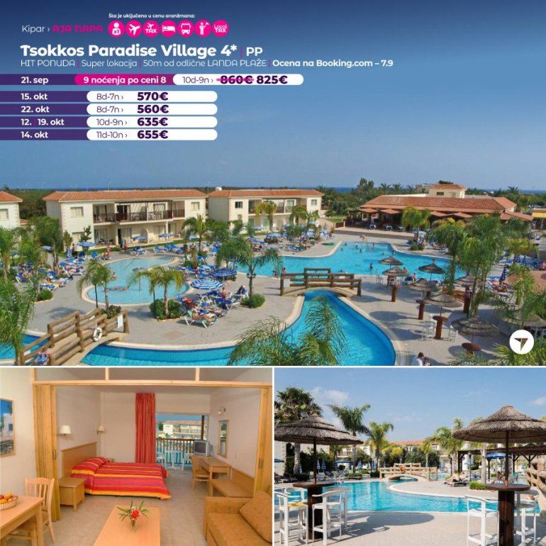 Ovo odmaralište sa 4 zvezdice nalazi se u letovalištu Aja Napa. Nudi zatvoreni bazen, fitnes centar, saunu i otvoreni bazen nepravilnog oblika, okružen nameštenom terasom za sunčanje. Sadržaji odmarališta Tsokkos Paradise takođe obuhvataju restoran-bar pored bazena, igraonicu sa bilijarom, teniski teren i mini-market.