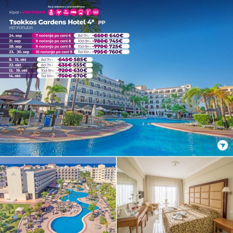 Ovaj objekat je udaljen 10 min hoda od plaže. Smešten u Protarasu, objekat Tsokkos Gardens Hotel nudi otvoreni bazen sa zasebnim delom za decu i terasu za sunčanje sa nameštajem na otvorenom. Hotel je udaljen 800 metara od plaže Sanrajz (Sunrise). Sve klimatizovane sobe imaju telefon, balkon i TV sa satelitskim kanalima. Do soba se dolazi liftom. Kupatilo je opremljeno fenom za kosu i tušem.