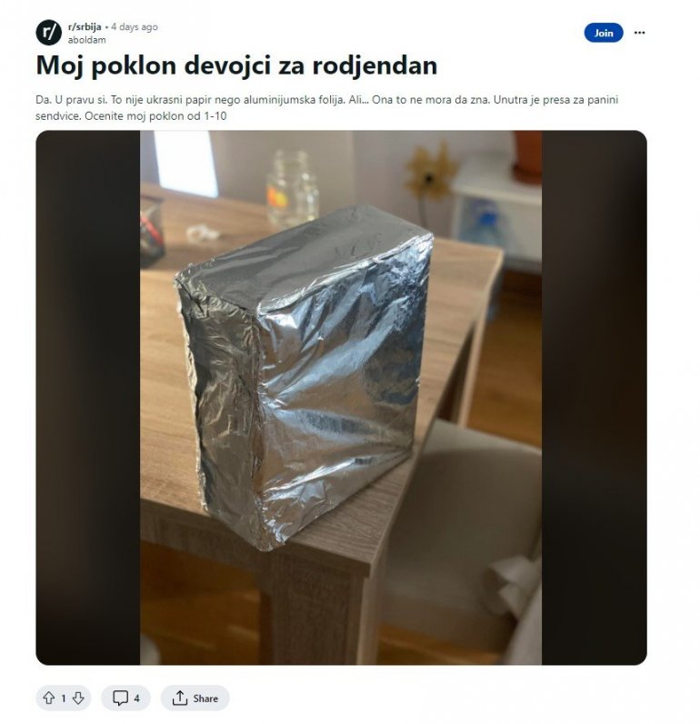 Neimenovani Srbin podelio je sa oduševljenjem na društvenoj mreži Redit fotografiju poklona koji je kupio i pripremio svojoj devojci za rođendan. Objašnjavajući da je umesto ukrasnog papira za "ukrašavanje" poklona koristio aluminijumsku foliju, otkrio je da se u kutiji, navodno, nalazi panini toster, što je šokiralo mnoge na internetu.