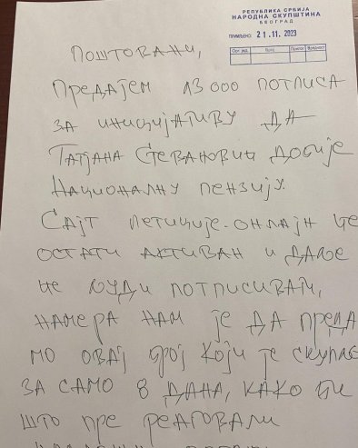 PETICIJA sa 13.000 potpisa da profesorka istorije Tatjana Stevanović, koja je teško povređena u tragediji u OŠ "Vladislav Rinbikar" dobije nacionalnu penziju predata je u Skupštini Srbije.