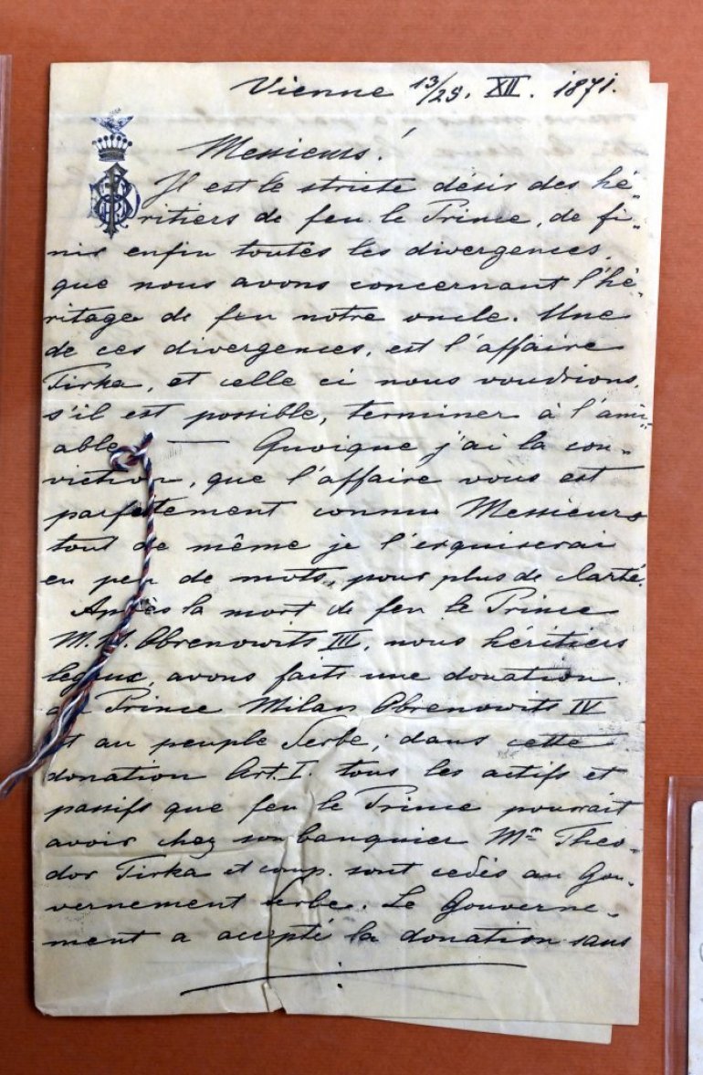 PISMO Miloša Nikolića, unuka kneza Miloša Obrenovića, upućeno 1871. godine namesniku srpskog kneževskog trona Milivoju Petroviću Blaznavcu iz Beča, na francuskom jeziku, uz prilog na komadu papira sa ručno ispisanim prevodom na srpski, jedan je od 158 vrednih istorijskih artefakata, koje je Muzej žrtava genocida darovao danas ustanovama kulture u Srbiji.