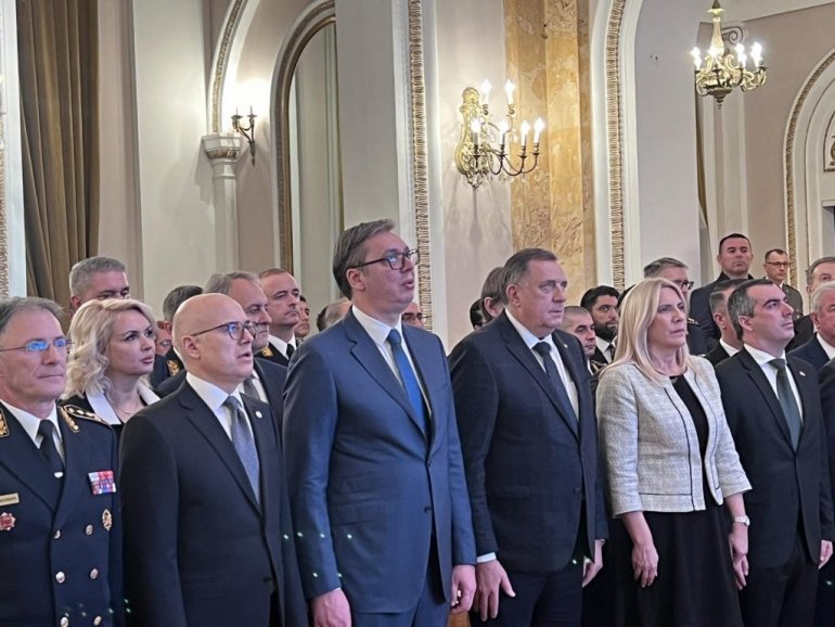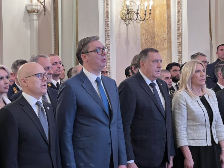 Među zvanicama na prijemu su i gosti iz Republike Srpske - Milorad Dodik, Željka Cvijanović, Draško Stanivuković, brojni ministri Vlade Srbije, kao i predstavnici diplomatskog kora.