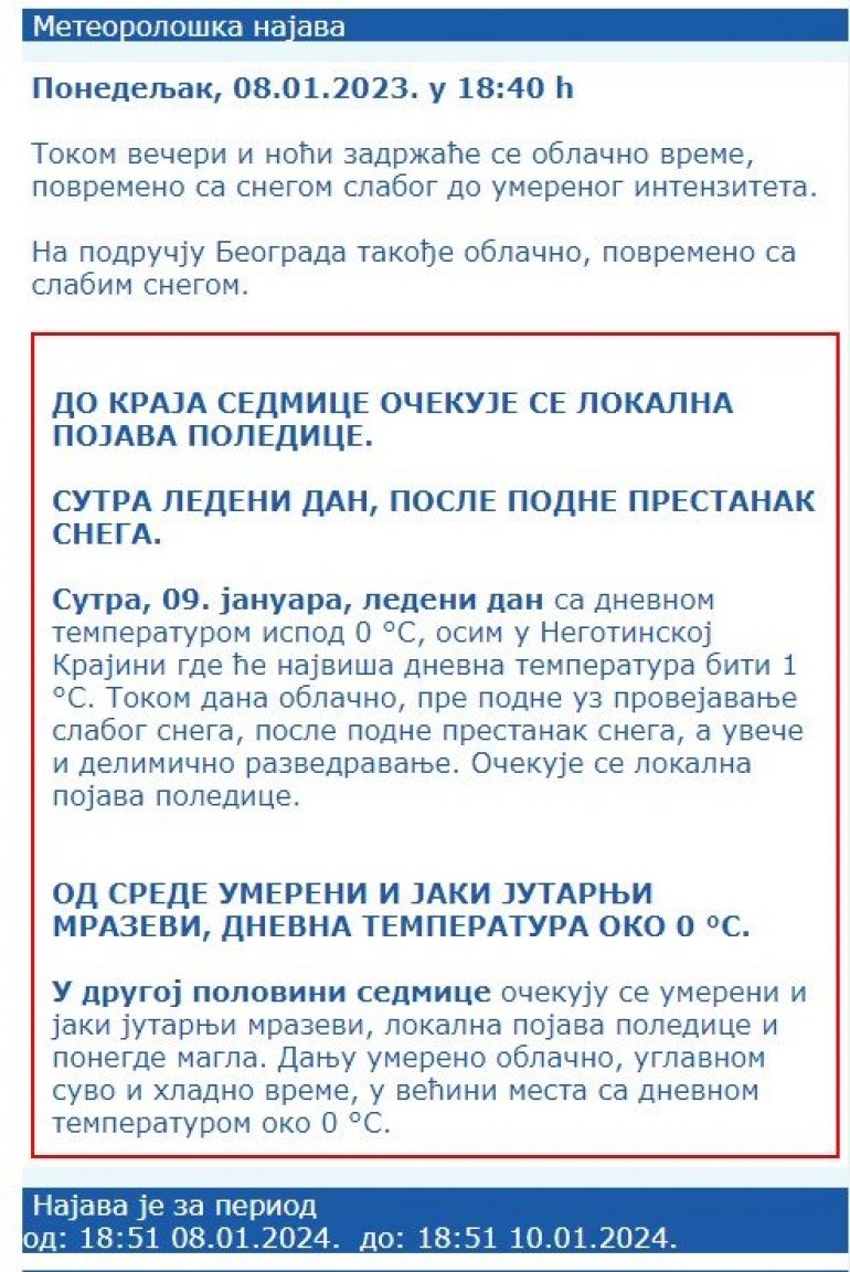 Dnevne temperature će 9. januara biti ispod 0 °C, osim u Negotinskoj Krajini gde će najviša dnevna temperatura biti 1 °C. Tokom dana oblačno, pre podne uz provejavanje slabog snega, posle podne prestanak snega, a uveče i delimično razvedravanje. Očekuje se lokalna pojava poledice. Foto; RHMZ