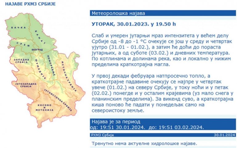 - Slab jutarnji mraz umerenog intenziteta u većem delu Srbije od -8 do -1 °S očekuje se još u sredu i četvrtak ujutro (31.01 - 01.02.), a zatim će doći do porasta jutarnjih, a od subote (03.02.) i dnevnih temperatura. Po kotlinama i dolinama reka, kao i lokalno u nižim predelima kratkotrajna magla - navodi se u RHMZ njavi.