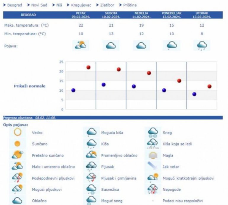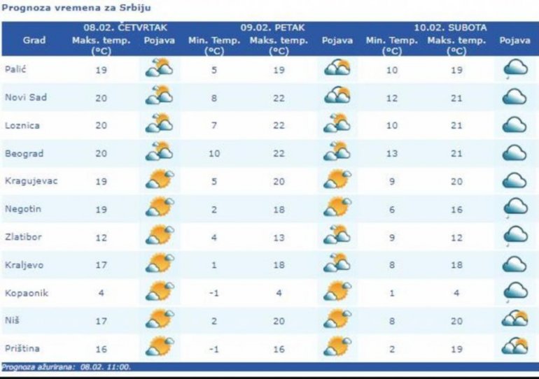 Temperatura će u toku dana varirati sve do subote ujutro, naročito van većih urbanih sredina u centralnoj i južnoj Srbiji, gde će minimalne temperature biti od -2 do 2°S, a najviše dnevne dostizati lokalno i do 20°S. Za vikend se očekuje da usled povećanja oblačnosti i pojačanja vetra dođe do značajnog smanjenja dnevnih temperaturnih oscilacija, najavio je RHMZ.