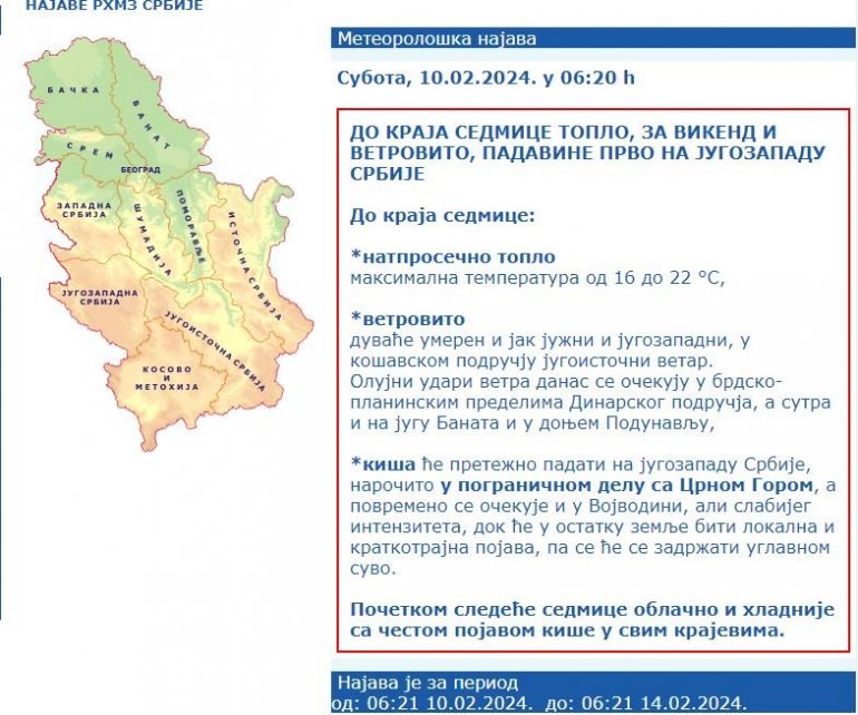 - Do kraja sedmice biće natprosečno toplo vreme sa temperaturama od 16 do čak 22 stepena. Duvaće umeren i jak južni i jugozapadni, u košavskom području jugoistočni vetar.Olujni udari vetra danas se očekuju u brdsko-planinskim predelima Dinarskog područja, a sutra i na jugu Banata i u donjem Podunavlju - stoji u najavi RHMZ.