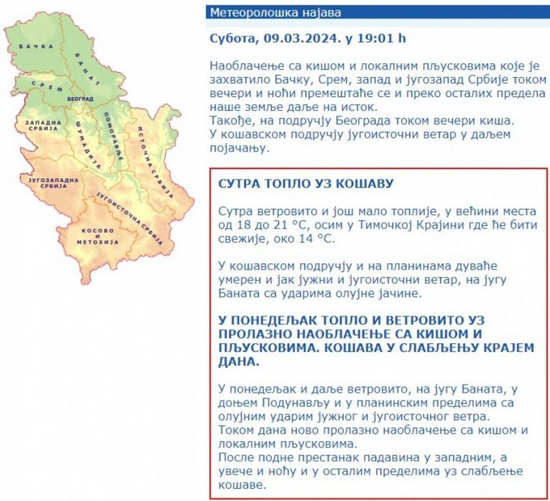 Duvaće veoma jak jugoistočni vetar, u košavskom području sa olujnim udarima, na jugu Banata i do 100 km/h, dok će na planinama duvati jak, na udare i olujni jugozapadni vetar.
