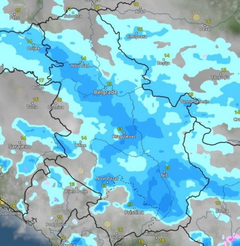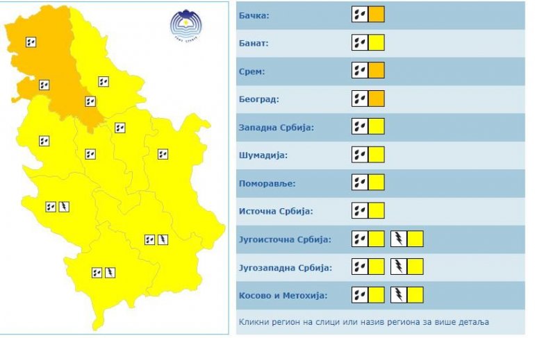 U Srbiji je trenutno na snazi žuti meteo alarm zbog kiše, a u jugoistočnoj i jugozapadnoj Srbiji, kao i na prostoru KiM upaljeno je upozorenje i zbog grmljavine.