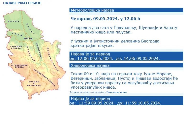 Danas i sutra na gornjem toku Južne Morave, Veternici, Jablanici, Pustoj i Nišavi vodostaji će biti u umerenom porastu sa mogućnošću dostizanja upozoravajućih nivoa.
