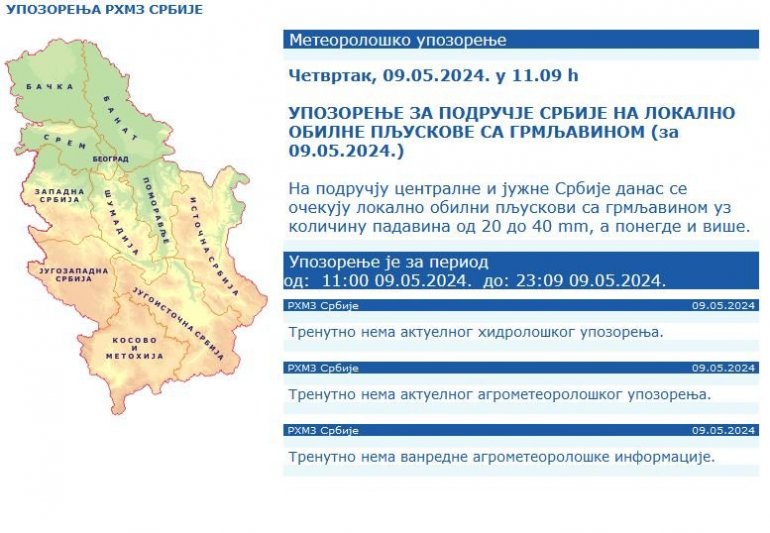 Na području centralne i južne Srbije danas se očekuju lokalno obilni pljuskovi sa grmljavinom uz količinu padavina od 20 do 40 mm, a ponegde i više.