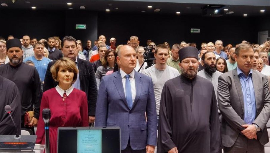 BUDUĆI HRAM NA LIMANU U SPOMEN SVIM MUČENICIMA: Prepun amfiteatar Rektorata u Novom Sadu na tribini o crkvi i verskim slobodama (FOTO)