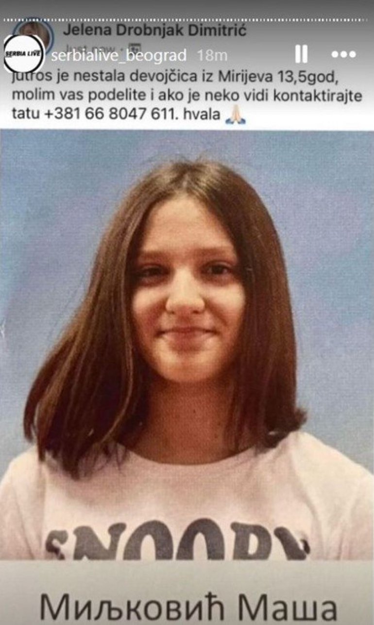 DEVOJČICA Maša Miljković (13) nestala je jutros u naselju Mirijevo.