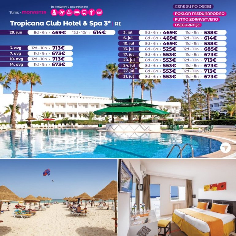 Tropicana Club Hotel and SPA je porodičan hotel idealno lociran. Nalazi se na plaži, 3km od aerodroma u Monastiru i 10km od Susa. Hotel izlazi na svoju peščanu plažu. Peškiri za plažu se mogu iznajmiti uz obavezan depozit.