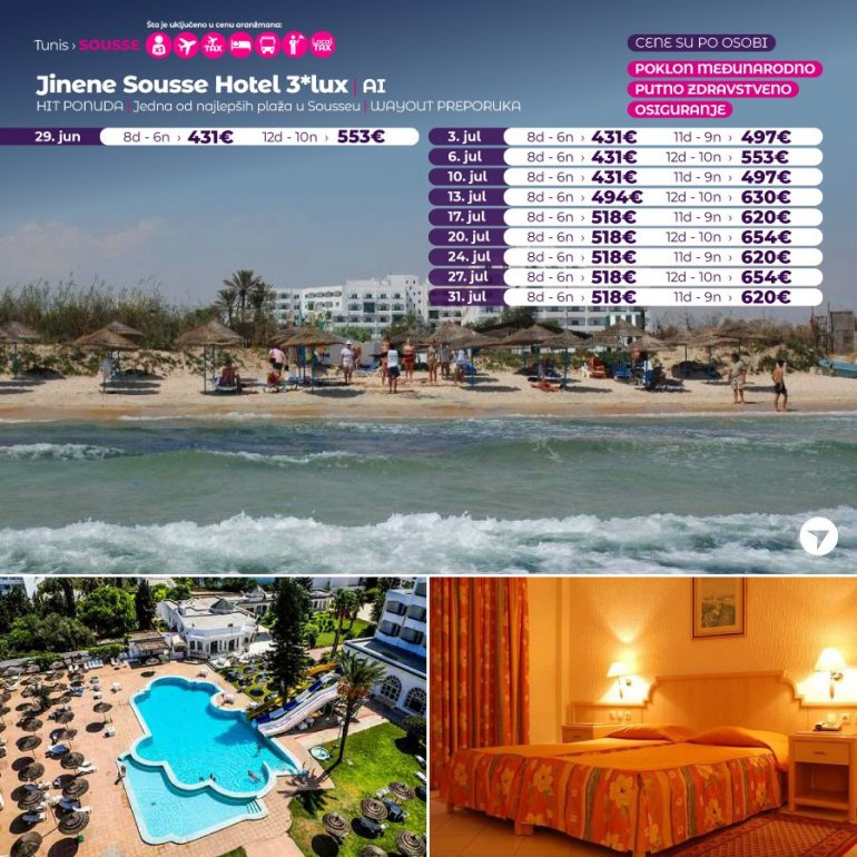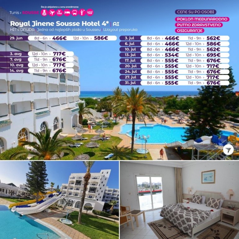 Hotel Jinene je skroman, mali hotel, na plaži. Udaljen je 4,5km od centra Sousse, 3km od centra Port el Kantaoui, 135km od aerodroma u Tunisu, 20km od aerodroma u Monastiru. Pripada hotelskom kompleksu Jinene koji čine dva hotela- Jinene3* i Royal Jinene 4*.