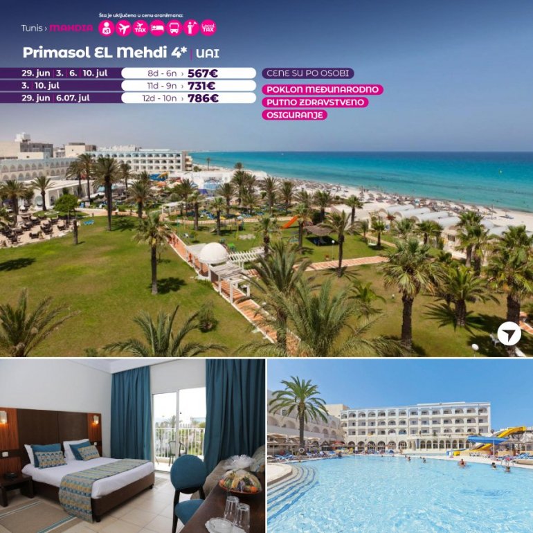 All-inclusive hotel Primasol El Mehdi se nalazi na 2 km od centra Mahdije i na 50 metara od privatne plaže, sa direktnim prilazom iz hotela. Hotel je na odličnoj lokaciji, u blizini starog dela grada.