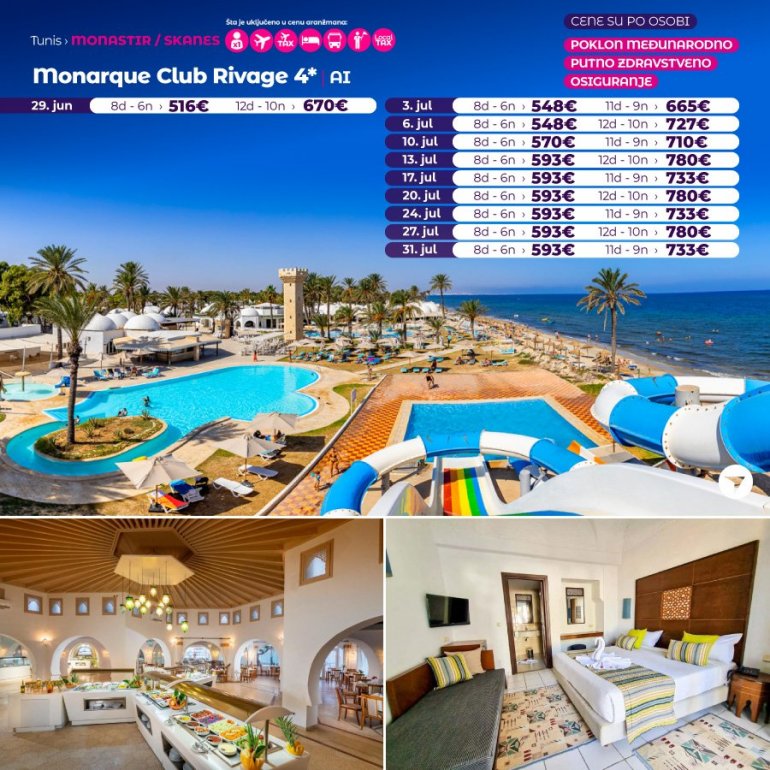 Monarque Club Rivage hotel nalazi se 4km od aerodroma u Monastiru i 12km od Susa. Hotel ima privatnu plažu, gde gosti mogu besplatno koristiti ležaljke i suncobrane, dok su peškiri dostupni uz depozit.