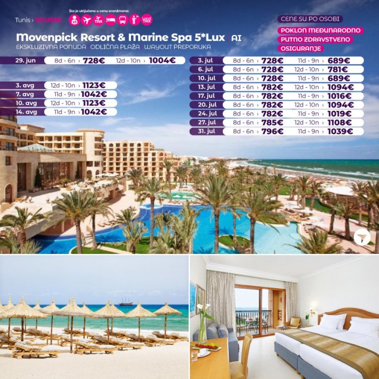 Nalazi se u samom centru grada, na plaži, nadomak medine, glavnih trgovačkih ulica i korniša - popločanog šetališta kraj mora. Hotel Hotel Movenpick Resort & Marine Spa Sousse poseduje svoju peskovitu plažu. Suncobrani, ležaljke i peškiri su na raspolaganju gostima bez doplate