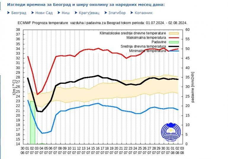 Prema grafikonu koji prikazuje mesečnu prognozu iz dana u dan, vidi se da za vikend dnevna temperatura skače preko 30 stepeni i do kraja jula neće biti većih padova, ali će biti i znatno toplijih dana. Eventualne padavine očekuju se u periodu od 8. do 21. jula, a RHMZ napominje da je mesečna prognoza orijentaciona i poželjno je koristiti je uz prognozu za 5 dana unapred.